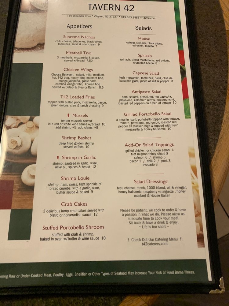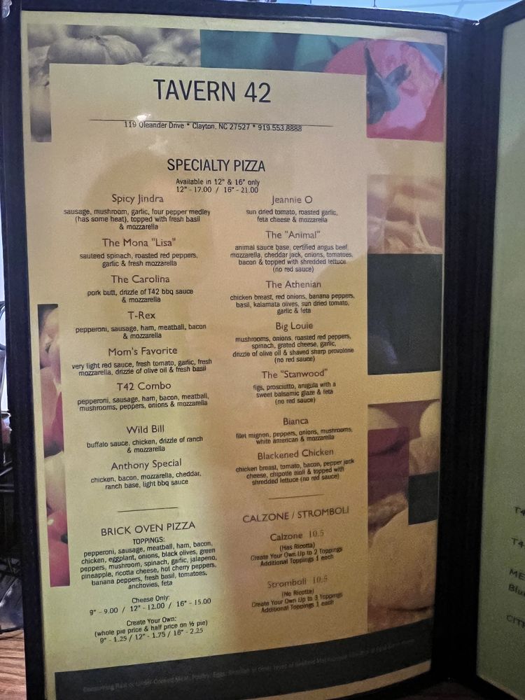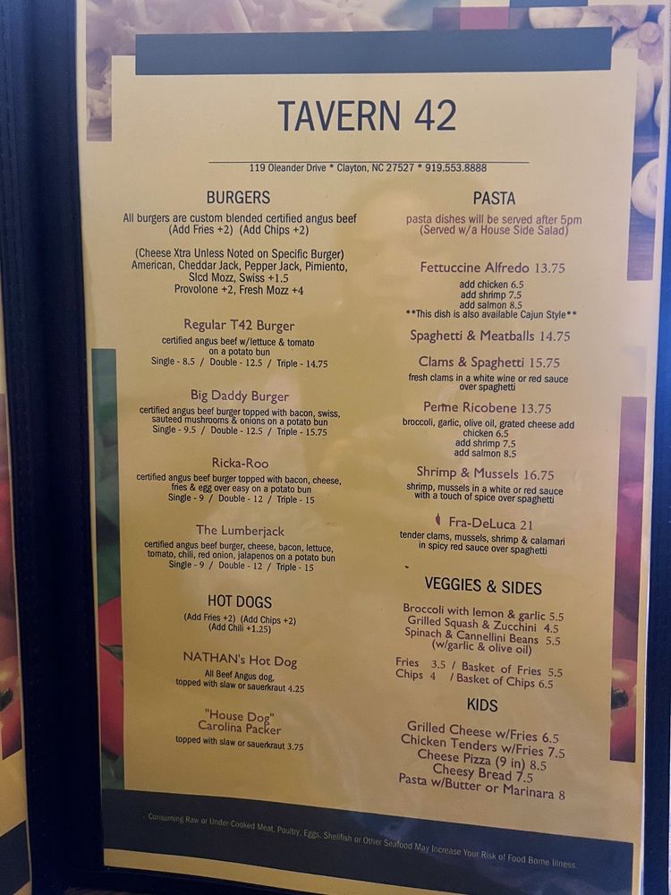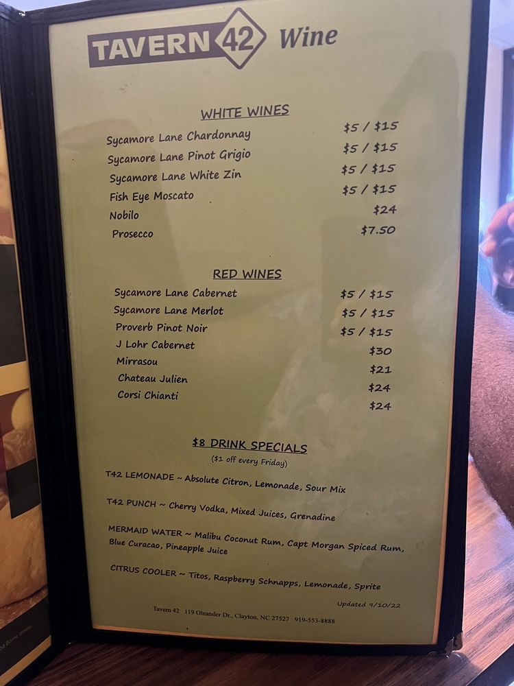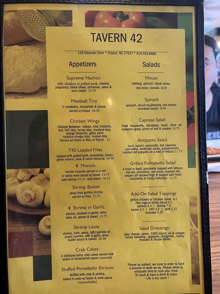 Tavern 42 is a popular spot in Clayton, NC, known for its delectable offerings in the categories of Pizza, Bars, and Burgers. With a cozy atmosphere and a diverse menu, this establishment offers a range of options suitable for all palates. From Bacon Boy Sandwich to Louisiana Chicken Sandwich, Tavern 42 prides itself on serving up flavorful dishes that keep customers coming back for more. The establishment also boasts various amenities such as Outdoor Seating, Casual dining, and a Full Bar. Customers rave about the fantastic service and the welcoming ambiance, making it a go-to spot for many. With a focus on quality ingredients and innovative specials, Tavern 42 continues to impress diners with each visit. Don't miss out on their signature dishes like the Mango Jalapeno Wings, Shrimp in Garlic, and the mouth-watering Stromboli. Experience the delightful flavors of Tavern 42 for yourself and indulge in a culinary journey worth savoring.