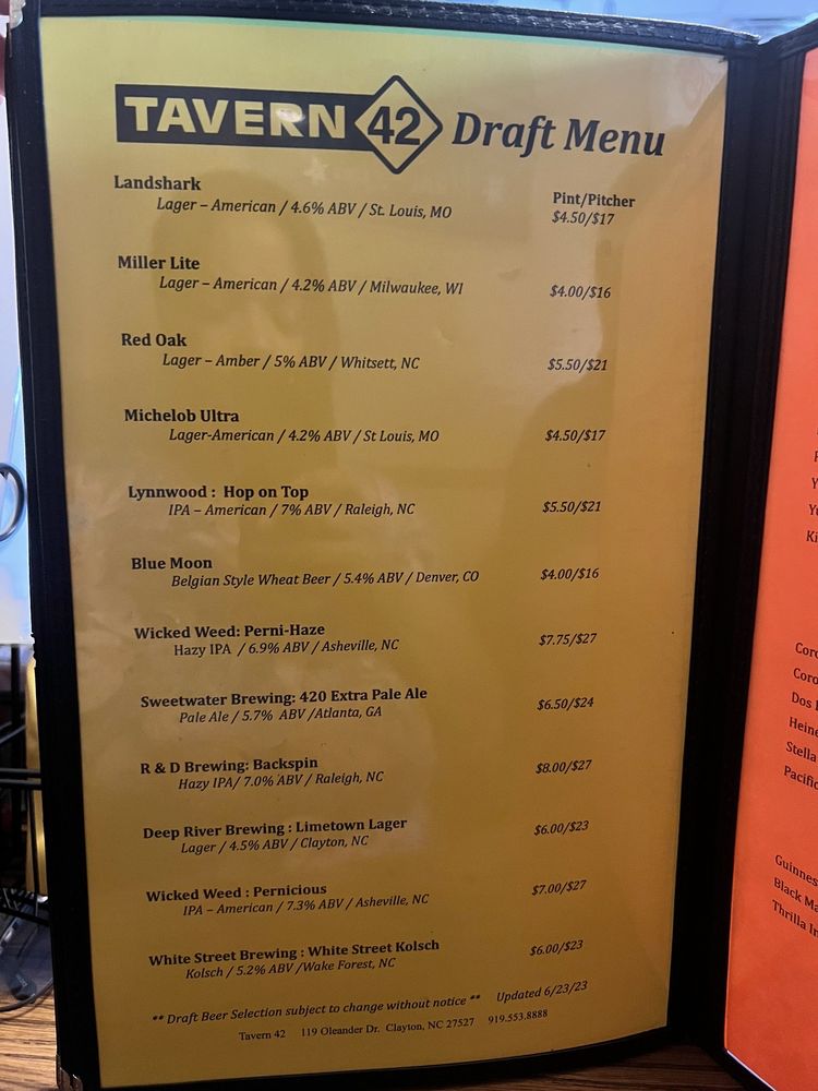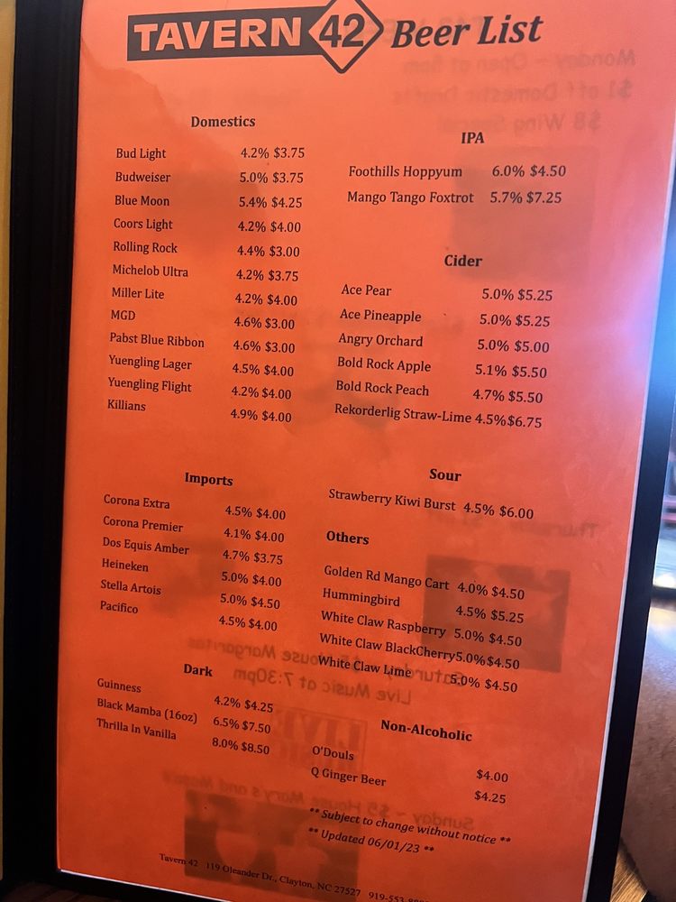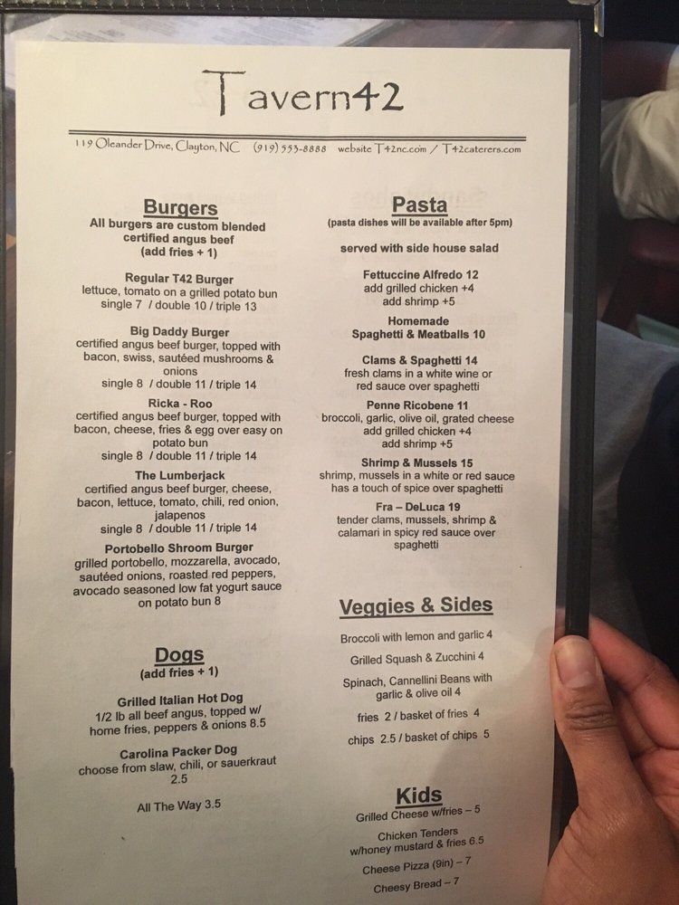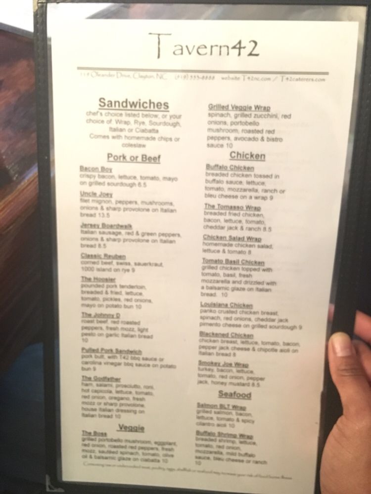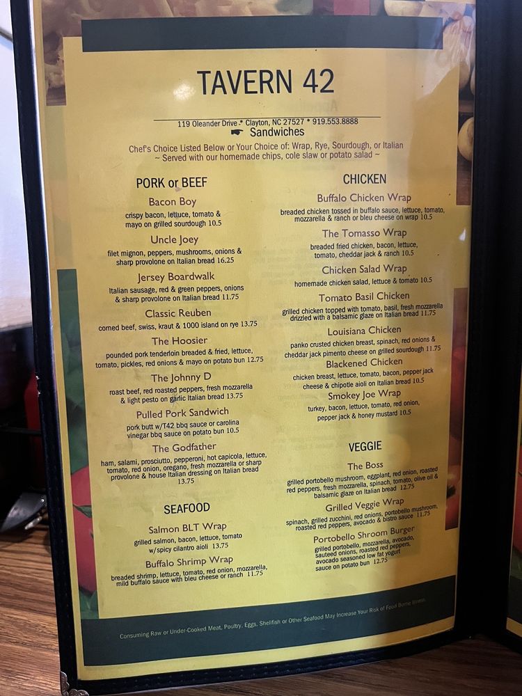 Tavern 42 is a popular spot in Clayton, NC, known for its delectable offerings in the categories of Pizza, Bars, and Burgers. With a cozy atmosphere and a diverse menu, this establishment offers a range of options suitable for all palates. From Bacon Boy Sandwich to Louisiana Chicken Sandwich, Tavern 42 prides itself on serving up flavorful dishes that keep customers coming back for more. The establishment also boasts various amenities such as Outdoor Seating, Casual dining, and a Full Bar. Customers rave about the fantastic service and the welcoming ambiance, making it a go-to spot for many. With a focus on quality ingredients and innovative specials, Tavern 42 continues to impress diners with each visit. Don't miss out on their signature dishes like the Mango Jalapeno Wings, Shrimp in Garlic, and the mouth-watering Stromboli. Experience the delightful flavors of Tavern 42 for yourself and indulge in a culinary journey worth savoring.